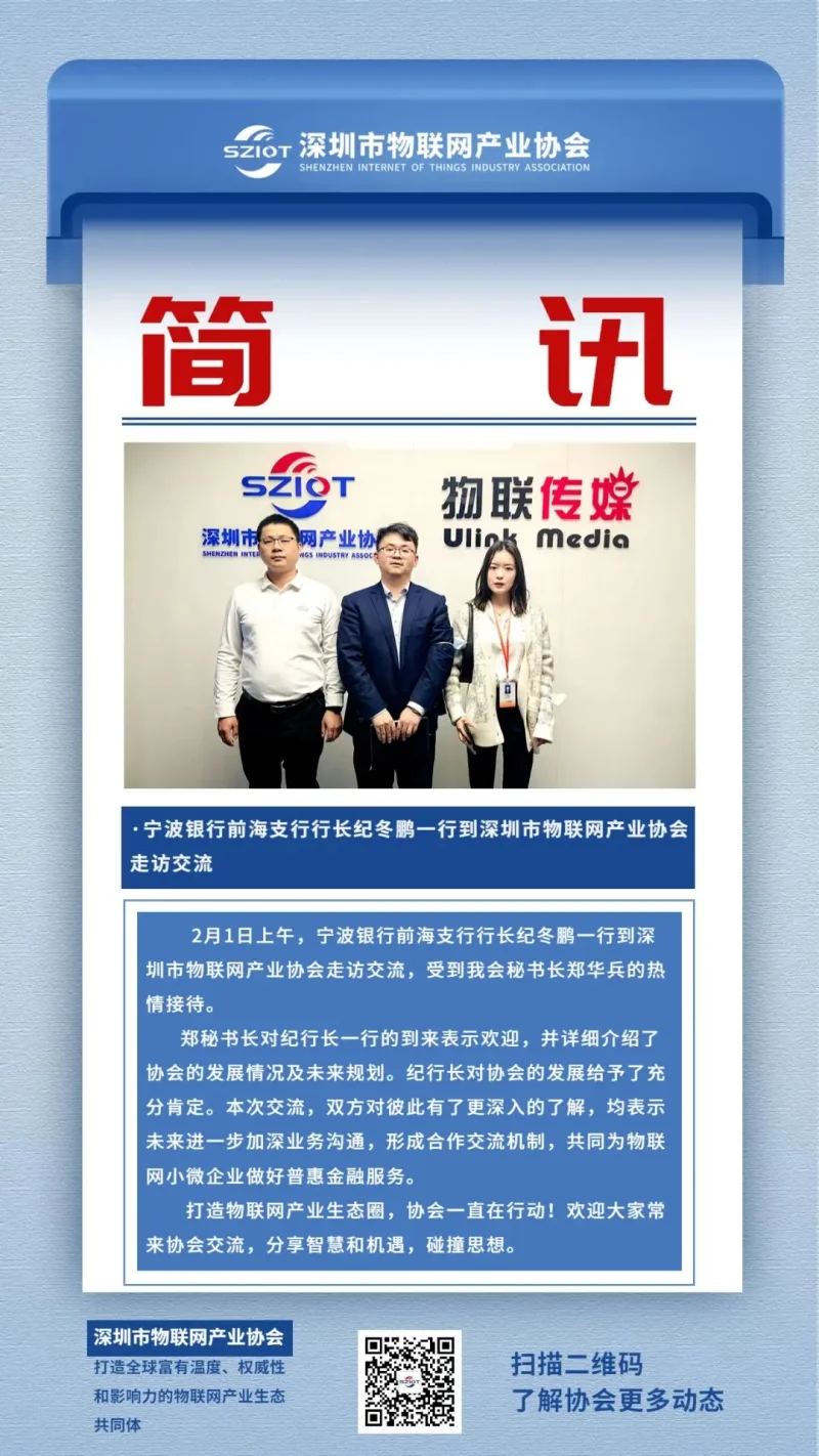 2月1日上午,宁波银行前海支行行长纪冬鹏一行到深圳市物联网产业协会走访交流。