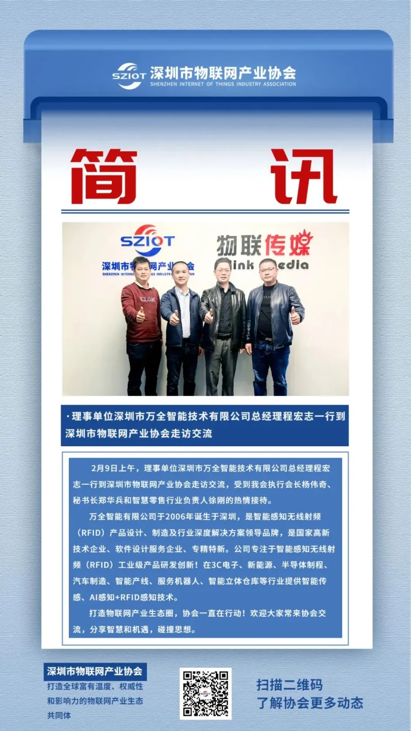 2月9日上午,理事单位深圳市万全智能技术有限公司总经理程宏志一行到深圳市物联网产业协会走访交流。