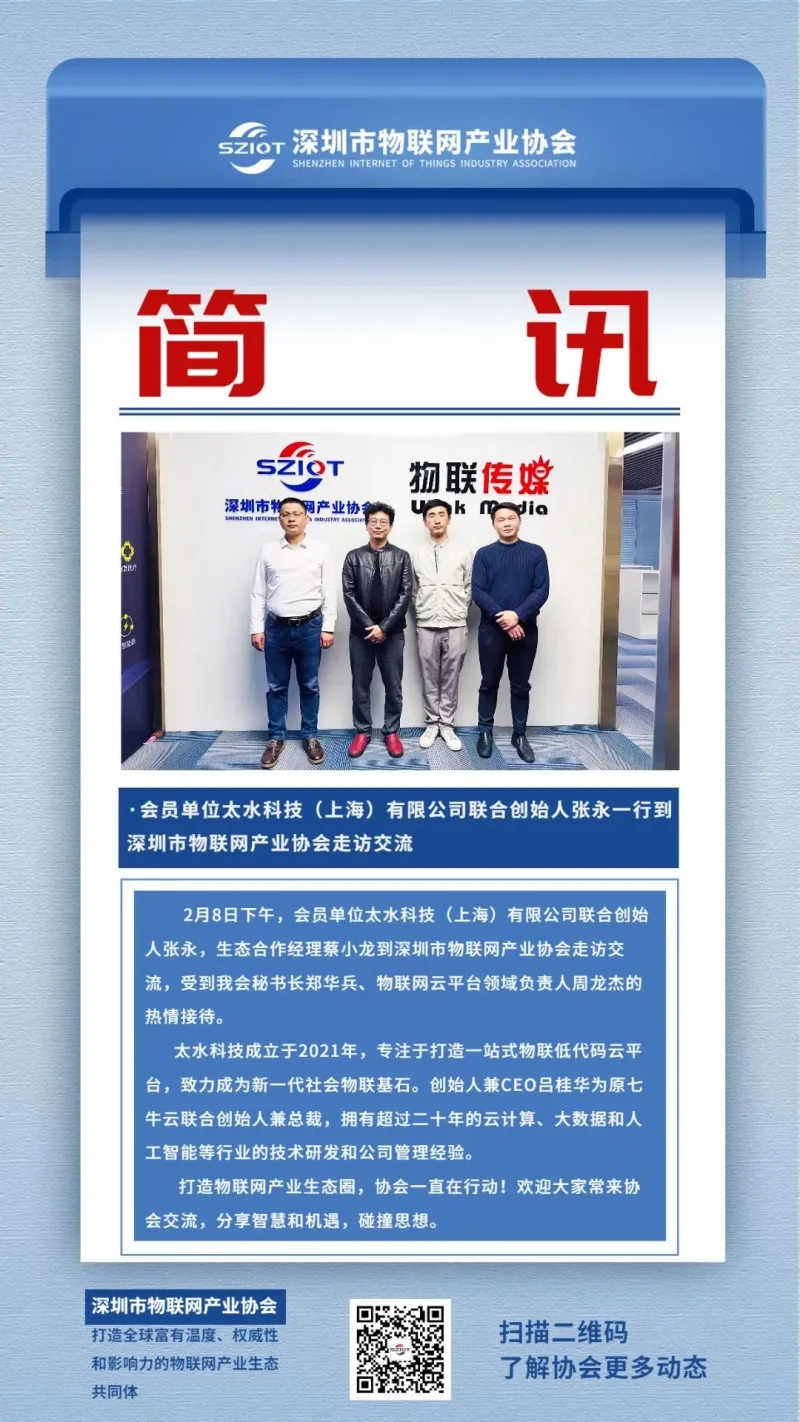 2月8日下午,会员单位太水科技(上海)有限公司联合创始人张永一行到深圳市物联网产业协会走访交流。