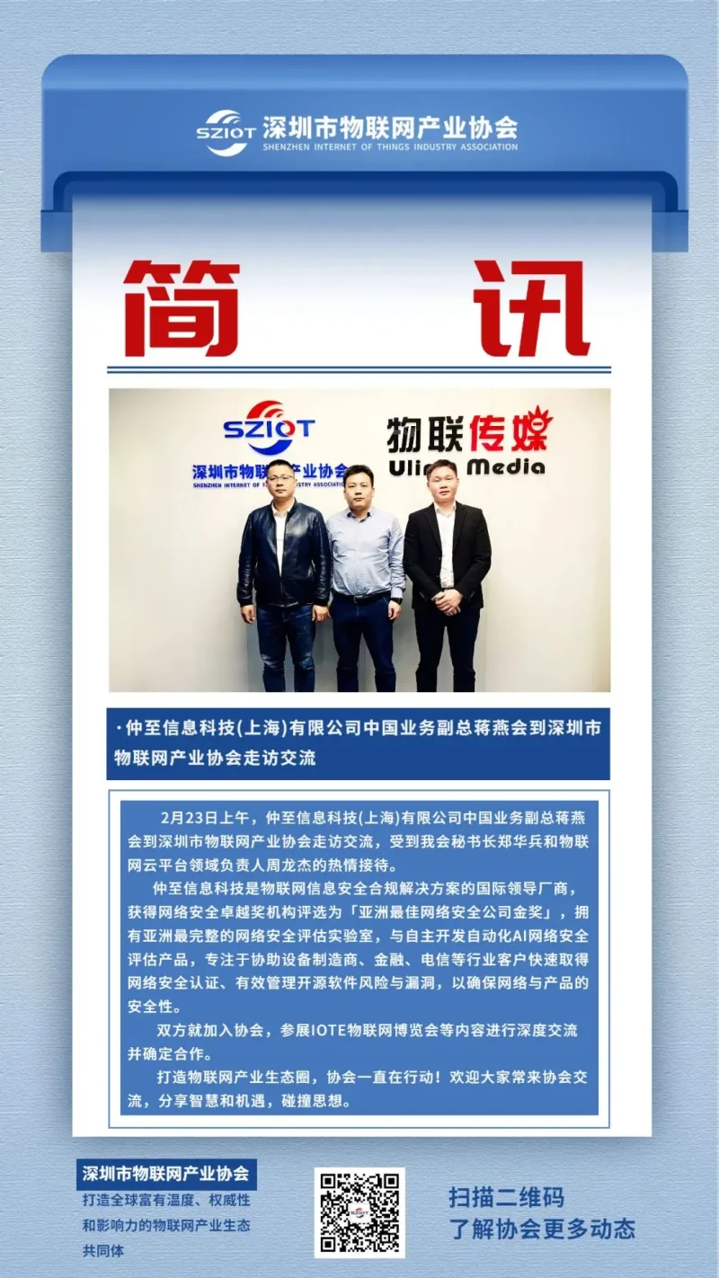2月23日上午,仲至信息科技(上海)有限公司中国业务副总蒋燕会到深圳市物联网产业协会走访交流。