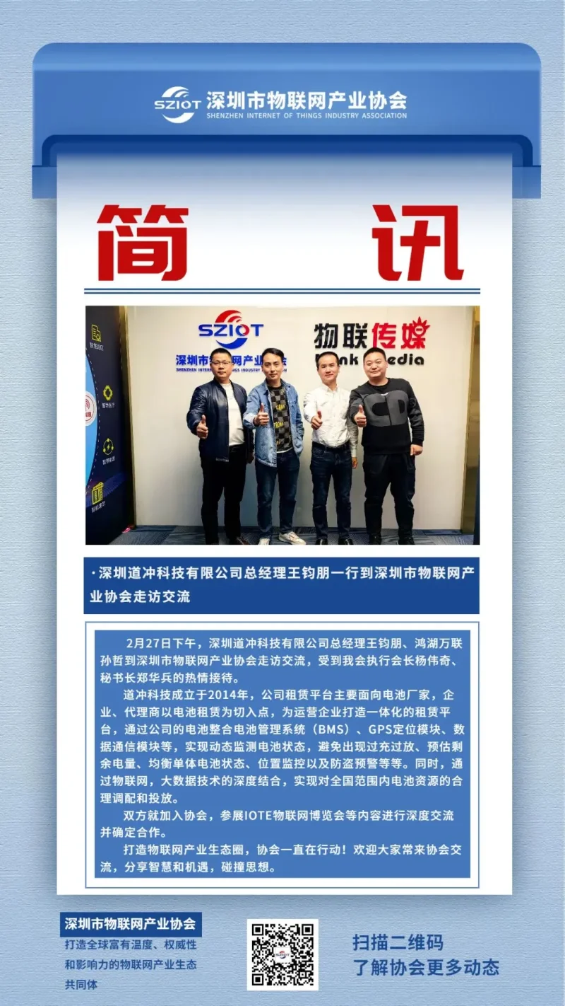 2月27日下午,深圳道冲科技有限公司总经理王钧朋、鸿湖万联孙哲到深圳市物联网产业协会走访交流。