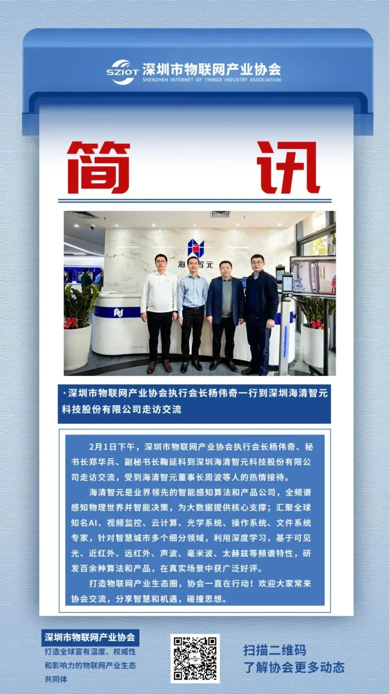 2月1日下午,深圳市物联网产业协会执行会长杨伟奇一行到深圳海清智元科技股份有限公司走访交流,受到海清智元董事长周波等人的热情接待。