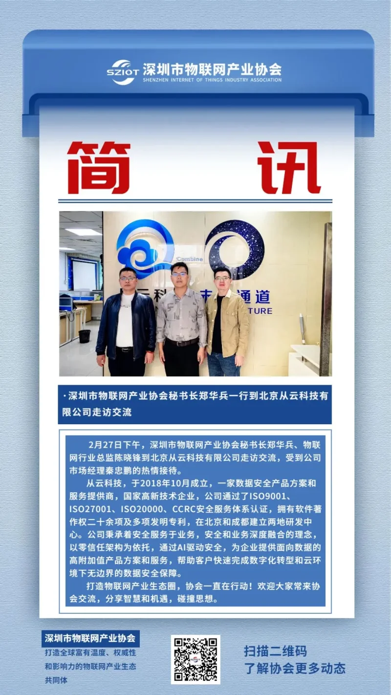 2月27日下午,深圳市物联网产业协会秘书长郑华兵、物联网行业总监陈晓锋到北京从云科技有限公司走访交流,受到公司市场经理秦忠鹏的热情接待。
