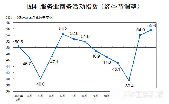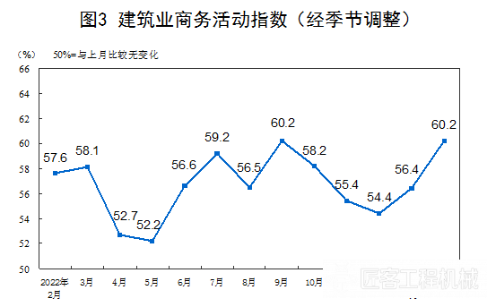 分行业看,建筑业商务活动指数为60.2%,比上月上升3.8个百分点。服务业商务活动指数为55.6%,比上月上升1.6个百分点。从行业情况看,道路运输、航空运输、邮政、住宿、租赁及商务服务等行业商务活动指数位于60.0%以上高位景气区间;批发、保险等行业商务活动指数低于临界点。