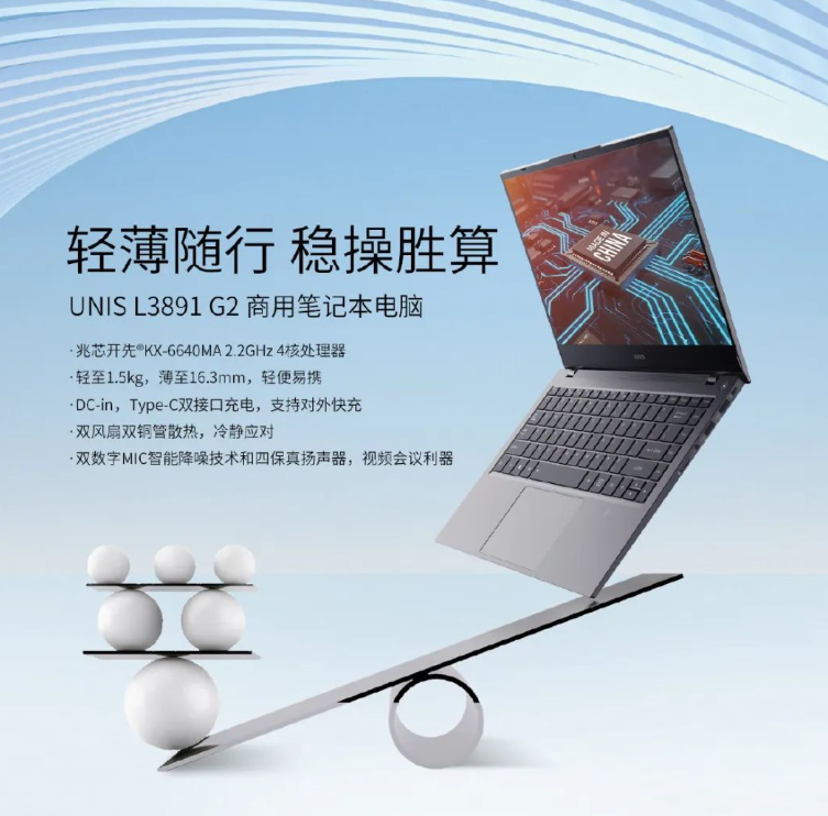 紫光 UNIS L3891 商用笔记本电脑,搭载兆芯开先 KX-6640MA 2.2GHz 4 核处理器,号称整机国产化率超过 85%。