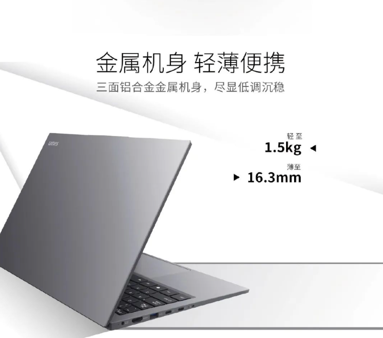 紫光 Unis L3891 笔记本采用三面铝合金机身,重量 1.5kg,厚度 16.3mm,配有双风扇双铜管散热。