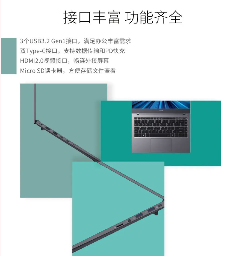 接口方面,该机配有 3 个 USB 3.2 Gen 1 接口、双 Type-C 接口(PD 快充)、HDMI 2.0、Micro SD 读卡器,摄像头还带有电子开关,并配有指纹识别。
