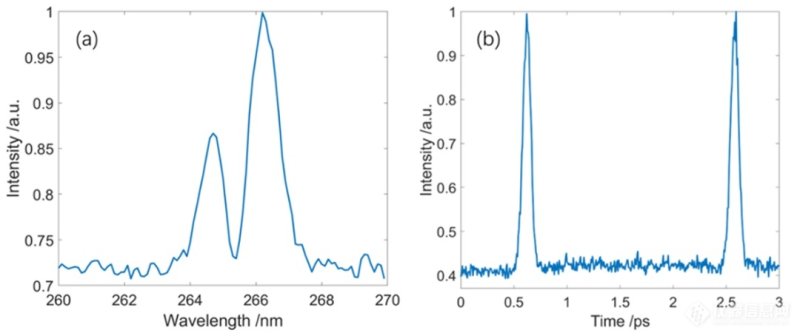 研究团队首先搭建了该种子激光系统,测试了两路三倍频产生紫外激光脉冲的能力,给出了三倍频的转换效率,同时测试了种子激光的中心波长如图3(a)中所示,得到了中心波长分别为 264.85 nm 和 266.28 nm的双色种子激光,在图3(b)中还展示了双脉冲种子激光的时间延迟,采用互相关法测量了双脉冲激光的脉宽以及时间间隔,单个紫外激光的脉冲宽度均为 170 fs,两个脉冲之间的时间间隔约为2 ps,通过调节光契角对,可以在 0-1 ps 之间连续改变两束紫外光的时间间隔。