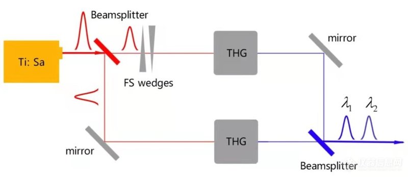 双色双脉冲种子激光是该方案的关键核心技术之一,其设计如下图2所示,基本方案是将 800 nm 常规激光分到两路三倍频系统,通过调节两路三倍频中 BBO 晶体的角度来独立调节输出紫外激光的中心波长,并且在一路三倍频系统中加入可调的时间延迟机构,之后将两路紫外激光合束,得到实验所需的双色双脉冲种子激光。
