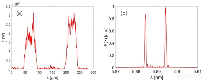图4 全相干软X射线双色FEL功率(a)和光谱(b)