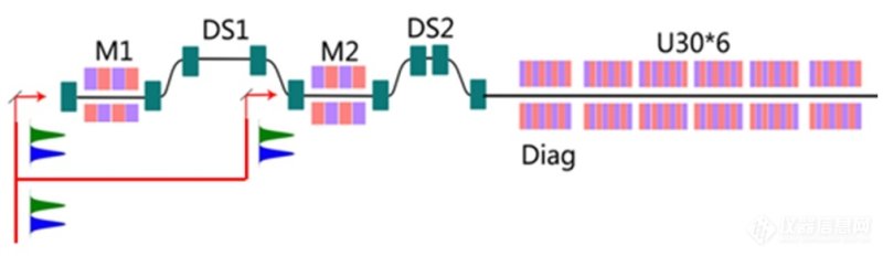 本研究课题提出了在 SXFEL 装置上、基于 EEHG产生双色 FEL 的新方案,利用双色双脉冲的种子激光系统,采用 EEHG 运行模式,产生软 X 射线波段的全相干双色 FEL,基本布局如图1中所示。在该方案中,由于所用种子激光包含两个中心波长不同的脉冲,因此最终通过EEHG产生的也是两个中心波长不同的软X射线FEL脉冲,也即产生了双色FEL。