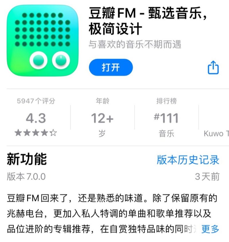 3 月 2 日,豆瓣 FM App 的 iOS / 安卓 7.0 版本正式发布,开发者显示为“北京酷我科技有限公司”,也就是酷我音乐的开发公司。