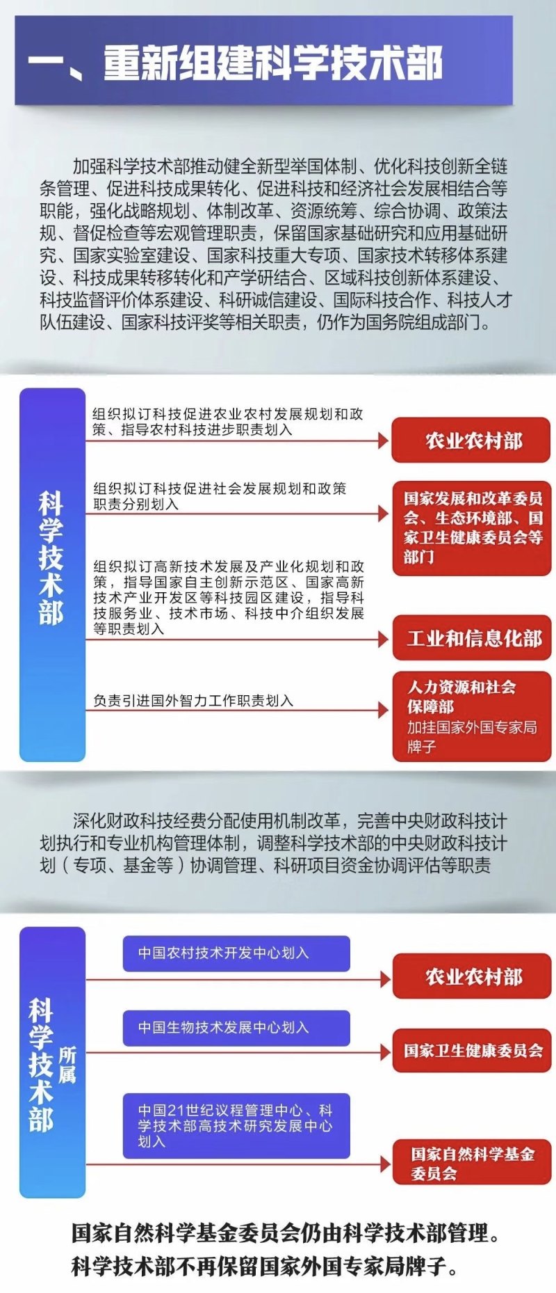 根据国务院关于提请审议国务院机构改革方案的议案,重新组建科学技术部。加强科学技术部推动健全新型举国体制、优化科技创新全链条管理、促进科技成果转化、促进科技和经济社会发展相结合等职能,强化战略规划、体制改革、资源统筹、综合协调、政策法规、督促检查等宏观管理职责,保留国家基础研究和应用基础研究、国家实验室建设、国家科技重大专项、国家技术转移体系建设、科技成果转移转化和产学研结合、区域科技创新体系建设、科技监督评价体系建设、科研诚信建设、国际科技合作、科技人才队伍建设、国家科技评奖等相关职责,仍作为国务院组成部门。