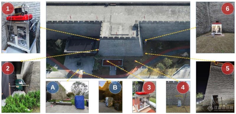 图:缪子成像探测仪器在西安城墙现场的实验布局。1-6号位置针对58号马面,A、B位置为空测位置。