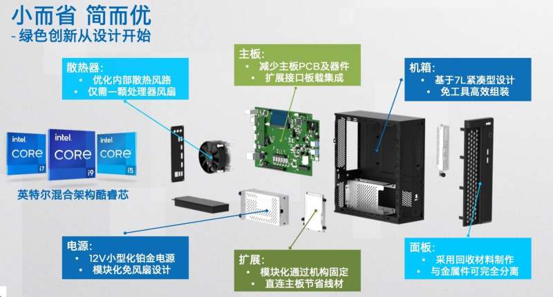 对于一台电脑来说,定义和设计是碳排放的源头,采用的物料数量和种类决定了生产制造的复杂度和碳排放,也关系着在结束生命周期后产品是否可以回收。因此,英特尔所倡导的绿色电脑在生产设计环节就大胆采用了“小而省 简而优”的设计理念。