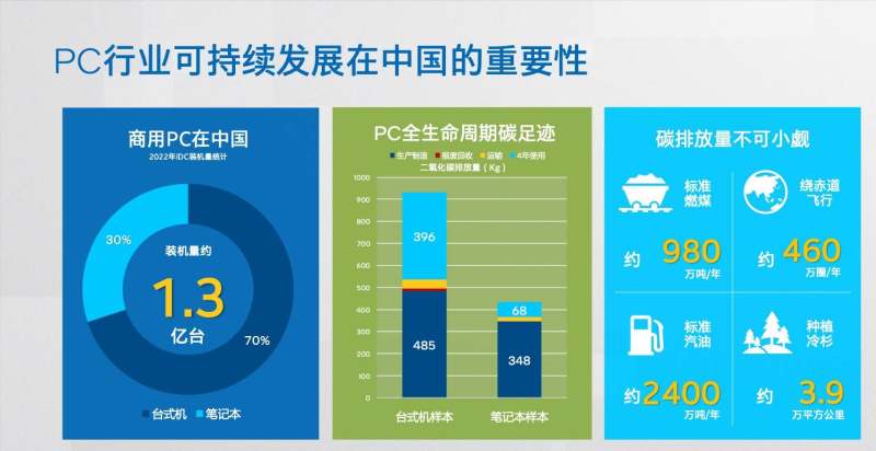 在很多人的认知里,降低碳排放的有效途径仅仅是“使用清洁能源”,但实际上,碳排放存在于我们生产生活中的每个环节,拿数字经济中无处不在的PC来说,其碳排放对绿色计算就是不可小觑的因素。根据2022年IDC装机量统计,商用PC在中国装机量达到1.3亿台左右,台式机占比70%。根据平均4年的PC全生命周期碳排放量计算,相当于消耗约980万吨标准燃煤或约2400万吨标准汽油,或者飞机绕赤道飞行约460万圈/年,如此多的碳排放需要种植约3.9万平方公里的冷杉来抵消。