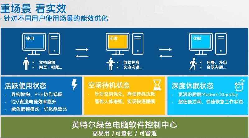 一般来说,当电脑交付到用户手上时,使用和维护的过程,几乎完全取决于使用者,但从厂商角度来看,依然有针对使用场景进行优化的空间,绿色商用电脑特有的低碳软件解决方案:“英特尔绿色电脑软件控制中心”就是最佳的范例,用户在软件中可将PC设定到低碳运行模式,并可以实时了解PC的运行功耗。相关数据还可被收集汇总,便于管理单位统一进行部署和能效管理。不但如此,英特尔绿色电脑软件控制中心还内置了“低碳模式”,当用户在日常使用且不需要太高性能的时候,就可以通过打开低碳模式,结合12代酷睿处理器的异构架构来实现功耗的降低。最后,绿色商用电脑还可以通过智能传感器来识别使用者是否在电脑旁边,并智能执行降低屏幕亮度/关闭显示器/进入睡眠状态等指令,及时进入到更低功耗的模式中实现节能减碳。