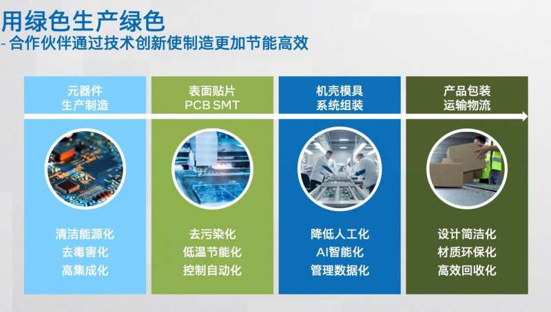 在这个过程中,英特尔从生产到交付的每个环节,都在积极践行绿色低碳,具体来说,在元器件生产制造环节,鼓励元器件生产制造商更多的采用清洁能源,并优先与绿色生产商合作;在PCB表面贴片环节,采用环保材料和绿色工艺,减少污染环境的可能;在机壳及系统组装环节,通过高度自动化降低对人力和能源的要求;最后在产品包装和运输物流环节,优化包装材料和运输路径,使制造更加节能高效。