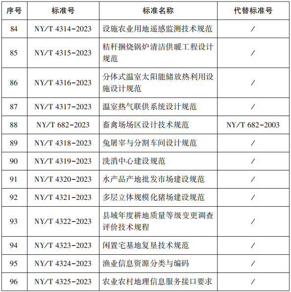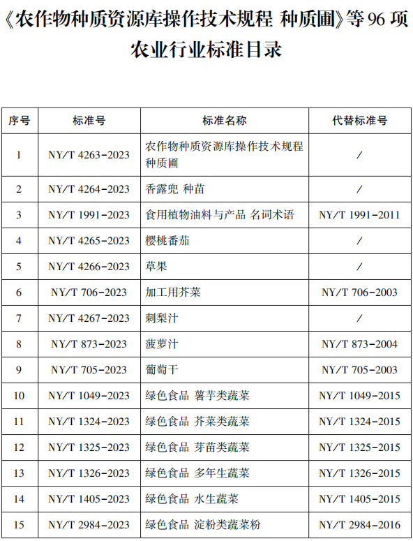 日前,农业农村部发布了中华人民共和国农业农村部公告第651号,公告透露,《农作物种质资源库操作技术规程 种质圃》等96项标准业经专家审定通过,现批准发布为中华人民共和国农业行业标准,自2023年6月1日起实施。