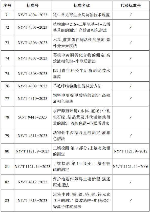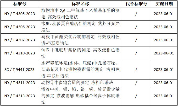 其中有部分为检验检测相关标准,涉及高效液相色谱法、紫外分光光度法、高效液相色谱-串联质谱法等,部分检验检测标准及96项农业行业标准目录如下。