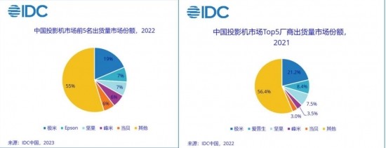 在品牌格局方面,IDC数据显示,2022年中国投影市场出货量前五依然是:极米(19%)、爱普生(7%)、坚果(7%)、峰米(6%)和当贝(6%),和2021年相比名单排序没有变化。