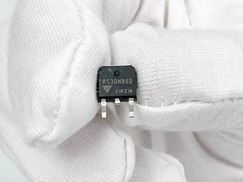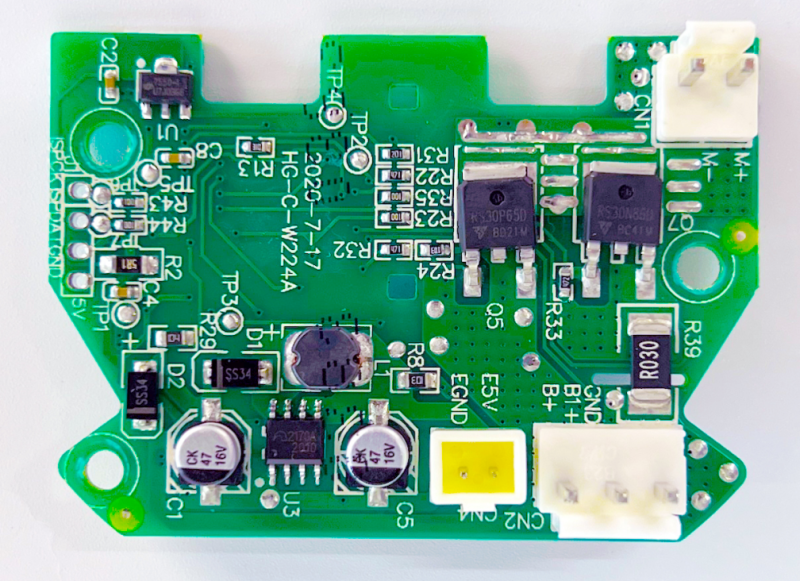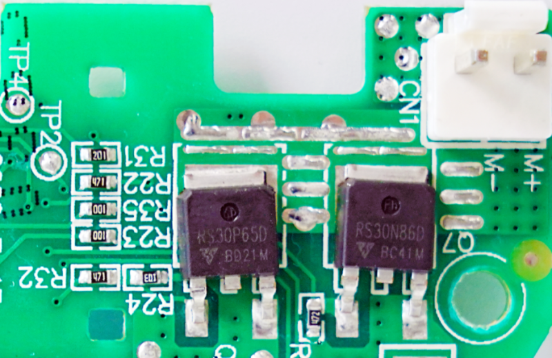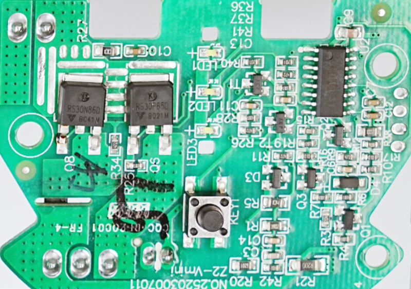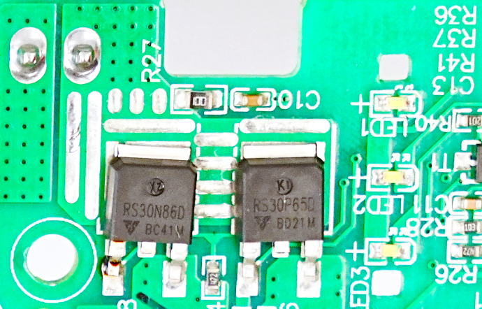 PCB板正反两面均使用了一颗瑞森半导体低压MOS-Trench系列中的N管RS30N86D型号。用于控制电机马达与电池放电及电机的正常运行。