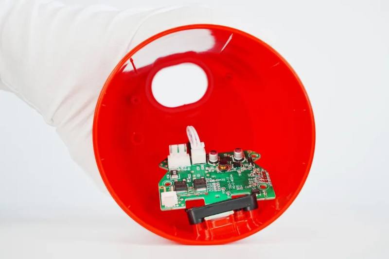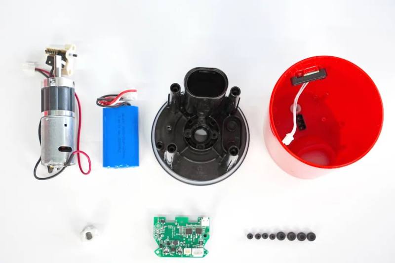 产品PCB上有充电接口、电池的保护电路、马达控制电路,充电口在外壳上用2PIN线材料与控制板相连。产品设有检测杯盖是否拧紧和拧到位等功能的微动开关,起到一个安全保护作用