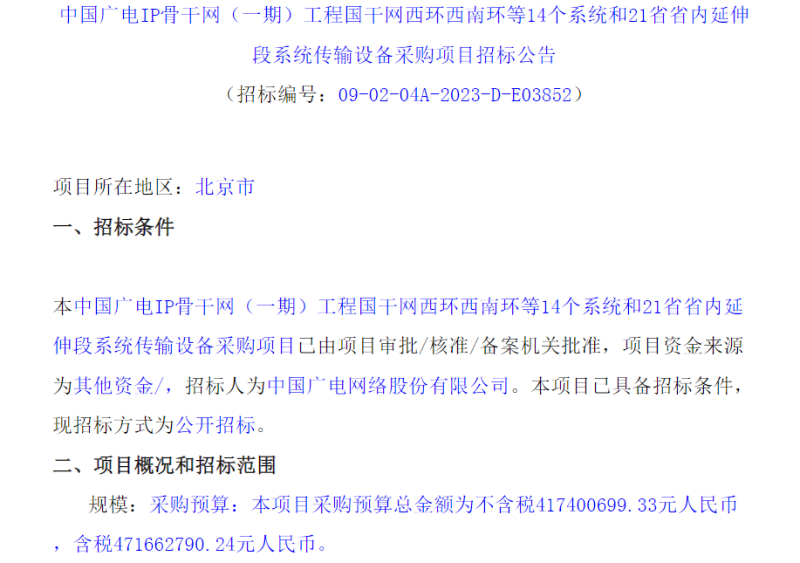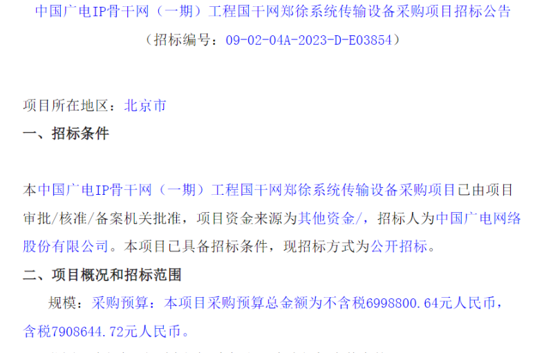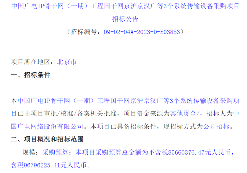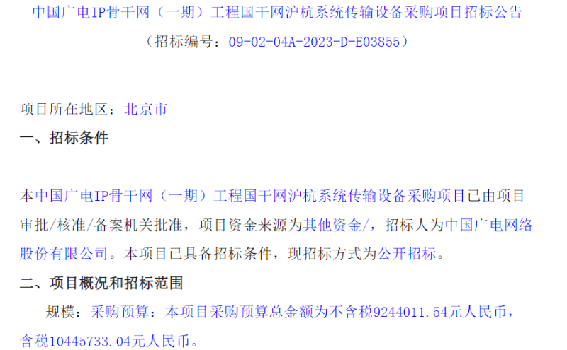 DVBCN注意到,中国广电网络股份有限公司在今天(3月9日)发出了一系列的中国广电IP骨干网(一期)工程国干网部分相关系统传输设备的招标公告,同时还有一项价值1327.5万元的整体工程监理服务项目。