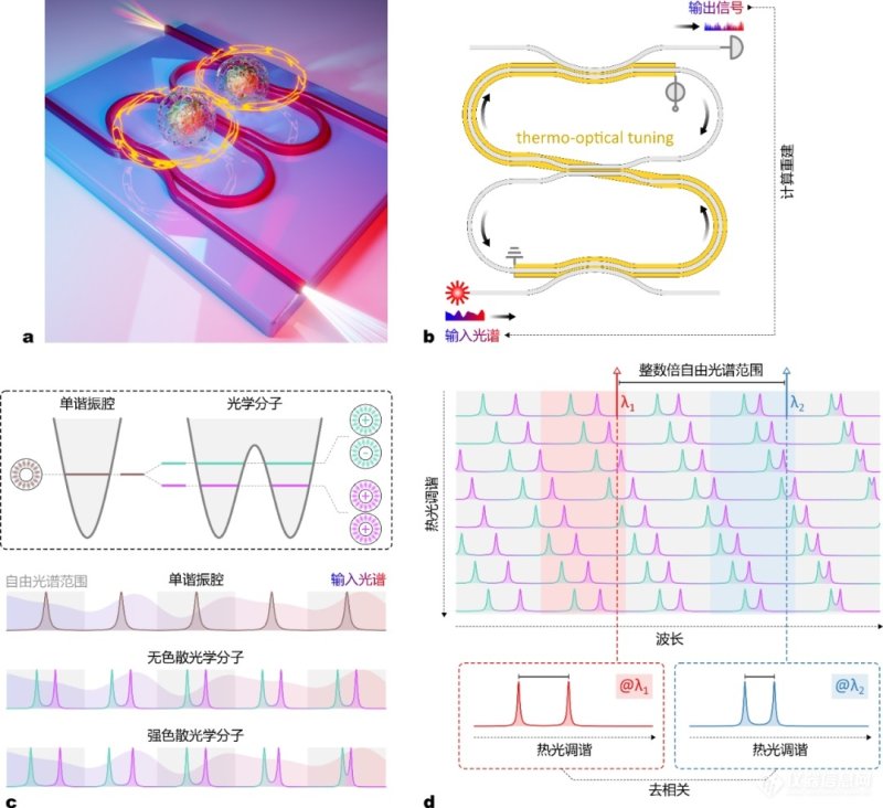 这一结构的基本组成是一对相同的可调谐微环谐振腔(图1a)。在热光调谐过程中,输入光谱被滤波采样,进而在输出端口生成包含谱信息的信号,最终通过计算重建方法将输入光谱还原(图1b)。此过程中,需要解决的核心问题是,如何分辨相隔自由光谱范围整数倍的波长通道。对于单谐振腔而言,各个自由光谱范围之内仅包含一个谐振模式,因此无法实现宽带谱重建。当一对谐振腔发生强耦合,各个谐振模式将劈裂为一个对称模式与一个反对称模式(图1c)。这一现象类似于双原子分子中存在的能级劈裂。值得注意的是,谐振模式的劈裂强度正比于谐振腔之间的耦合强度。因此,可以通过增强耦合强度的色散,使得“光学分子”谱线的劈裂强度随波长变化,并基于这一特征,识别位于不同自由光谱范围的波长通道。具体来说,当热光调谐经过一个自由光谱范围,各个波长通道对应的输出信号均包含一对尖峰;此时,即便对于相隔自由光谱范围整数倍的波长通道,其尖峰之间的间距仍然不同,因此不同波长通道得以去相关(图1d)。