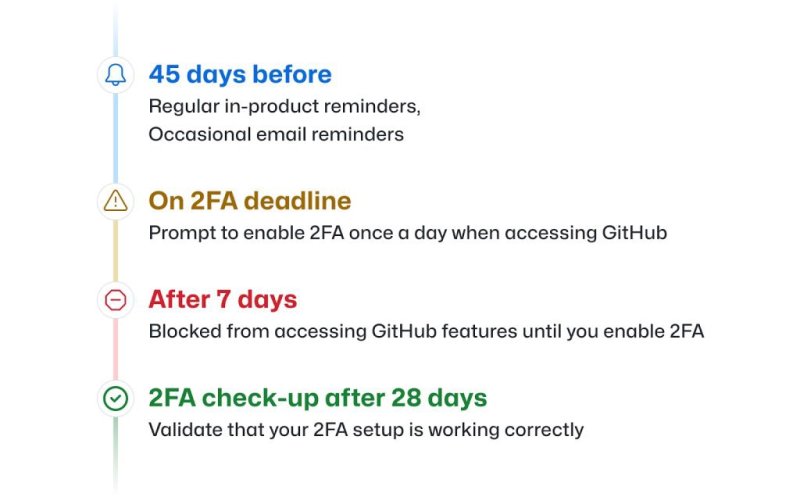 GitHub 表示将渐进式推进 2FA 要求,首先从开发人员和管理员开始。这些用户会收到电子邮件提醒,会在网页版 GitHub 上看到横幅提示。开发人员有 45 天的时间来设置 2FA,之后会有一周的缓冲期,如果开发人员还不设置 2FA 将会限制账户访问。