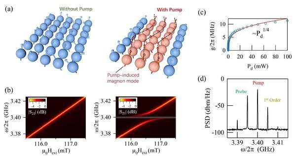 铁磁绝缘体单晶球中的磁子态,最早于 1956 年由美国物理学家 Robert L. White 和 Irvin H. Slot Jr.在实验中发现。根据他们的实验结果,同一年 L. R. Walker 给出了磁性块体空间受限磁子态的数学描述,称为 Walker modes。在随后长达 70 年中,块体磁性材料中研究的磁子态几乎都属于 Walker modes 范畴。陆卫教授团队的发现突破了这一范畴,发掘了新的磁子态。在低磁场下,铁磁绝缘体单晶球在受到强微波激励时,内部的非饱和自旋会获得一定的协同性,产生一个与微波激励信号同频率振荡的自旋波(图 (a)),该自旋波可被称为“光诱导磁子态(pump-induced magnon mode, PIM)”。光诱导磁子态如同一种“暗”态,无法按传统探测方法直接观测,但可通过其与 Walker modes 强耦合产生的能级劈裂被间接观察到(图 (b))。光诱导磁子态的有效自旋数受激励微波调控,因此当改变激励微波的功率时,耦合劈裂的大小会按照功率四分之一次方的关系变化(图 (c)),展现出和常规 Autler-Townes 劈裂不一样的功率依赖关系。此外,研究团队还发现光诱导磁子态具有丰富的非线性,这种非线性会产生一种磁子频率梳(图 (d))。相较于微波谐振电路中产生的频率梳,这一绝缘体中产生的新型频率梳不存在电子噪声,因此有望在信息技术中实现超低噪声的信号转换。