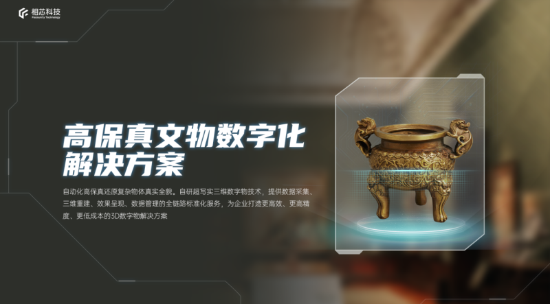 在此背景下,针对文物保护的一系列难题,相芯文物高保真数字化解决方案基于自研超写实三维数字物技术,可为文博领域客户提供数据采集、三维重建、效果呈现、数据管理的全栈数字物应用支持,从资产搭建和价值延伸等维度推动文物数字资产体系建设,为文物保护添加“数字屏障”。