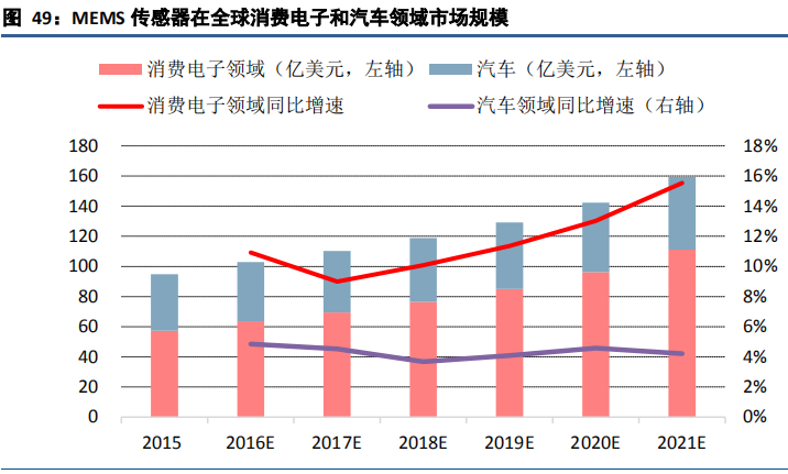 MEMS 传感器在全球消费电子和汽车领域市场规模