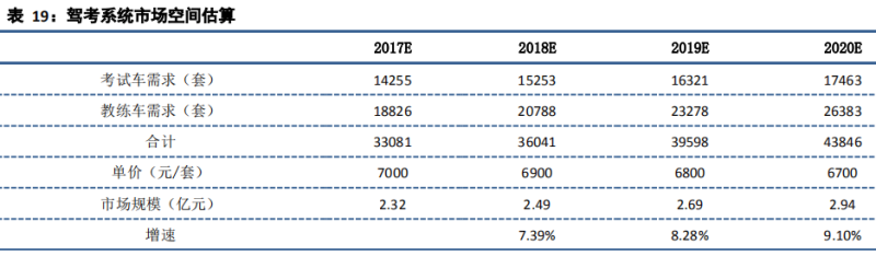 随着经济的快速发展,我国车辆数量迅猛增加。截至 2017 年底,我国汽车保有量达 2.17 亿辆,同比增长11.85%,驾驶人总数为 3.42 亿人,同比增长 10.32%。截至 2018 年 2 月 9 日,我国共有 2876 个县级行政区划,按照每个县级区划有一个车管所计算(假设县级车管所在科目二考试时具有 10 辆考试车、在科目三考试时具有10 辆考试车),约有 5.7 万辆考试车;截至 2017 年 6 月底,我国共有驾校 16743 所,教练车达 75 万辆左右。我们按每套系统单价 7000 元,有 10%的教练车安装了智能驾考系统计算,则市场空间约为 9.24 亿。对于智能驾考系统来说,其使用寿命一般为 3-5 年,以此估算每年驾考系统使用空间约为 2.3 亿左右。