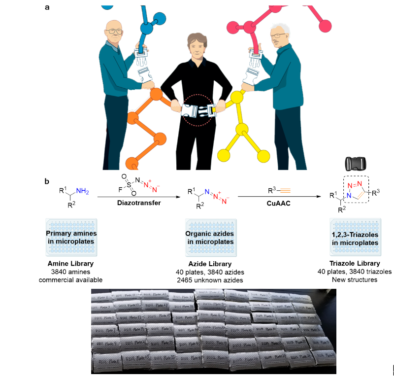图1 模块化的点击化合物库简介。a. 点击化学获2022年诺贝尔奖(https://www.nobelprize.org/educational-nobel-prize-lessons-chemistry-2022/);b. 模块化的点击化合物库构建方法。