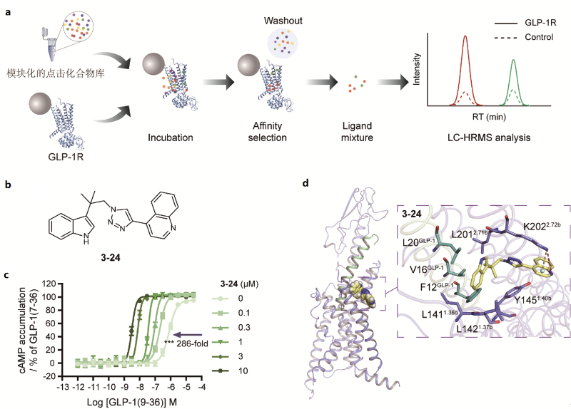 图2 模块化的点击化合物库与亲和质谱联用筛选GLP-1R配体。a.亲和质谱实验方案;b.配体3-24的化学结构;c.不同固定浓度的3-24对GLP-1(9-36)诱导产生cAMP的促进作用;d.分子对接模型显示3-24在GLP-1R的细胞外别构口袋中的结合模式。