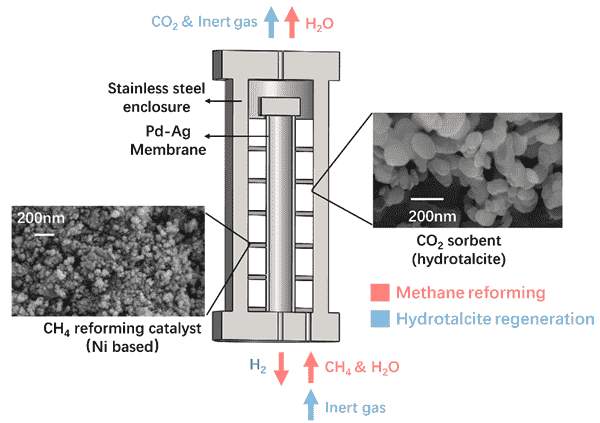 中国科学院工程热物理研究所首次实现了400°C温和条件下“净零排放”的天然气制氢原理突破。通过有序分离氢气和CO2产物,天然气制氢反应温度由传统的800-1000°C降至400°C以下,实现了99%以上甲烷直接转化为高纯氢与高纯CO2,并实现了基于化石能源的制氢与脱碳的完全协同。制氢与脱碳能耗下降幅度达20-40%。基于此,该工作结合商业化中温槽式聚光技术,实现了太阳能驱动的天然气制氢与脱碳,进一步减少化石能源制氢的碳足迹,展示了化石能源与可再生能源互补实现可持续氢能利用的可行性。反应温度的降低使工业余热与氢能的结合成为可能。迄今为止,研究人员已完成了超过6000次的稳定循环实验,验证了该方法的可靠性,并初步展示了技术转化应用的广阔前景。