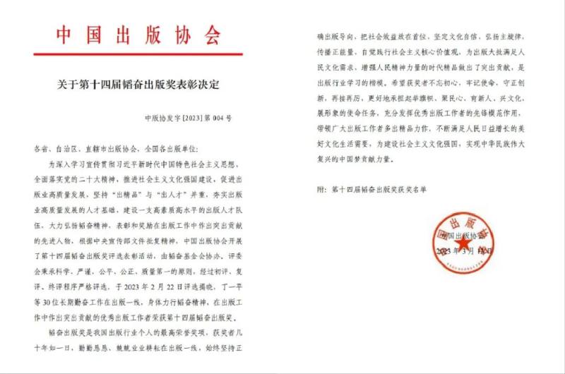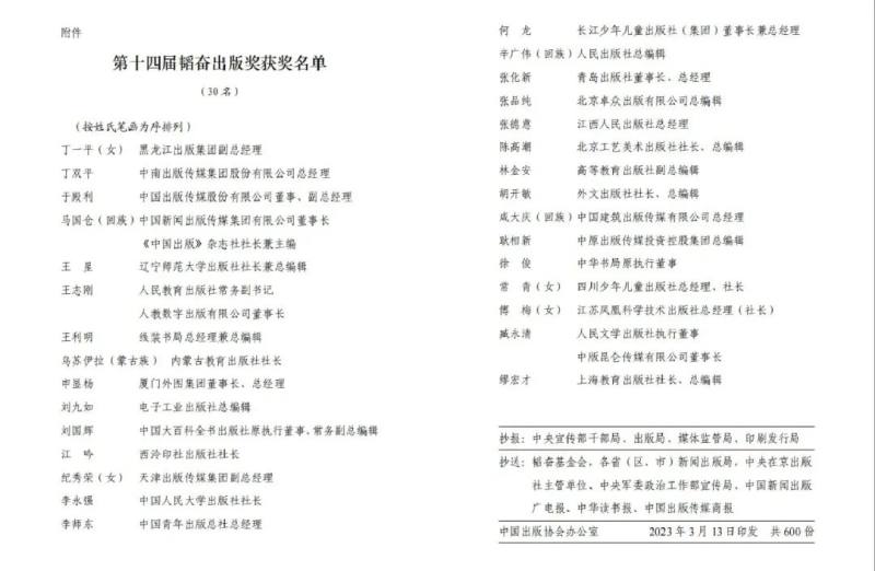 韬奋出版奖设立于1987年,是我国出版行业个人的最高荣誉奖项,由中国出版协会主办,韬奋基金会协办,每三年评选一次。本届韬奋出版奖评选经过初评、复评、终评等严格程序,于2023年2月22日评选揭晓。30名获奖者几十年如一日,勤勤恳恳、兢兢业业耕耘在出版一线,始终坚持正确出版导向,把社会效益放在首位,坚定文化自信,弘扬主旋律,传播正能量,自觉践行社会主义核心价值观,为出版大批满足人民文化需求,增强人民精神力量的时代精品作出了突出贡献,是出版行业学习的楷模。