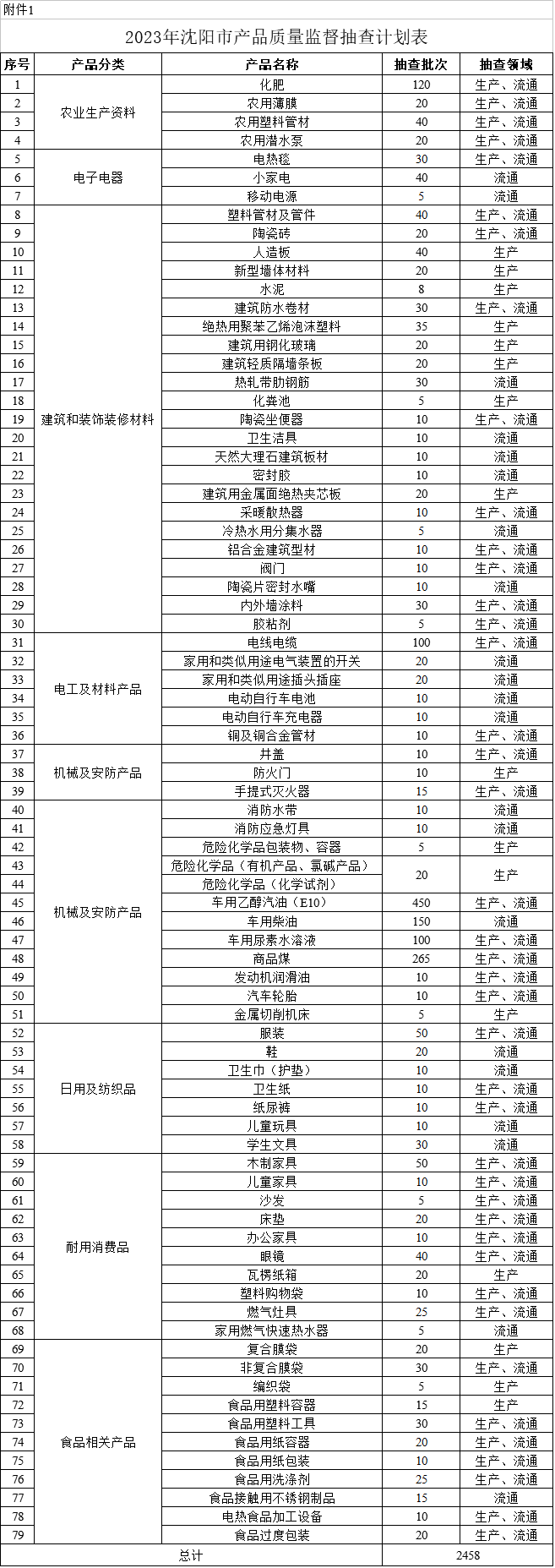 附件:1.2023年沈阳市产品质量监督抽查计划表