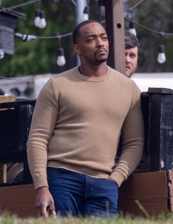 从照片来看,安东尼·麦凯饰演的“二代美队”穿着针织衫和牛仔裤,十分放松地靠在片场,这套或许就是他在片中的休闲服。