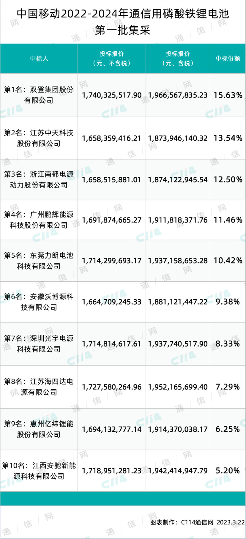 C114讯 3月22日消息(焦焦)从中国移动官网获悉,中国移动日前公示了2022年至2024年通信用磷酸铁锂电池产品第一批次集采结果,双登、中天、南都、鹏辉等10家中标。