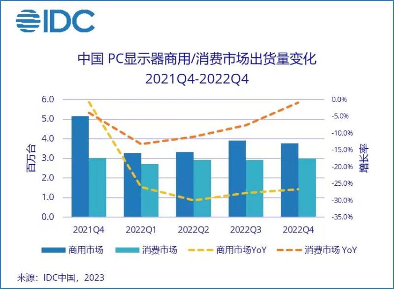 IDC数据,2022年全年中国PC显示器出货量为2583万台,同比下降20.1%;其中消费市场同比下滑8.3%,商用市场同比下滑27.6%。终端需求疲软,全产业链承压前行。