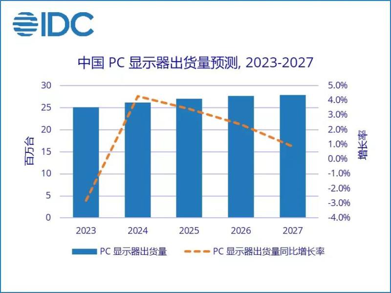 IDC预测,2023年中国PC显示器难以实现快速反弹,需求的集中释放将会延缓到2024年。IDC预计,2024年中国PC显示器出货量为2618万台,同比增长4.3%。