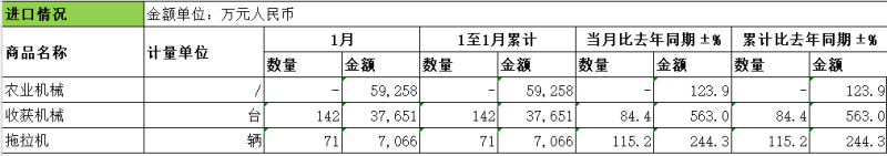 拖拉机方面:12份进口数量为71辆,进口金额为7,066万元;当月进口数量比去年同期增长115.2%,当月进口金额比去年同期增长244.3%。