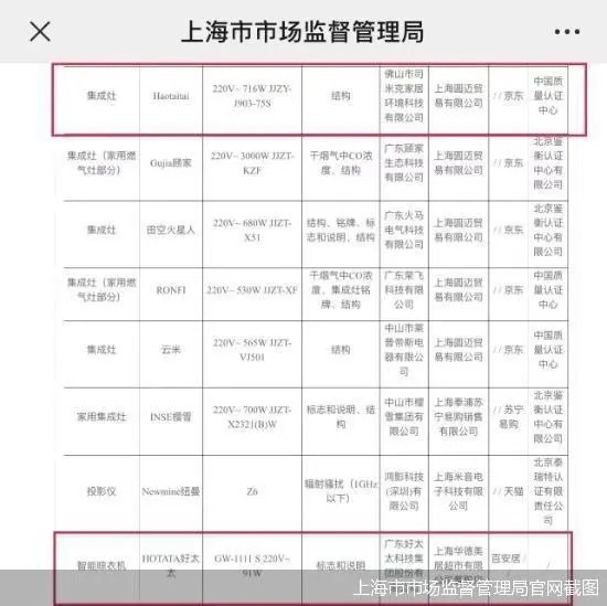 这张产品抽检不合格名单2023年3月17日由上海市场监督管理局发布。标称商标为“Haotaitai”的品牌抽检不合格的是一款“集成灶”,标称生产企业为“佛山市司米克家居环境科技有限公司”,被检不合格项目为“结构”;标称商标为“HOTATA好太太”的品牌抽检不合格的是一款“智能晾衣机”,标称生产企业为“广东好太太科技集团股份有限公司”,被检不合格项目为“标志和说明”。