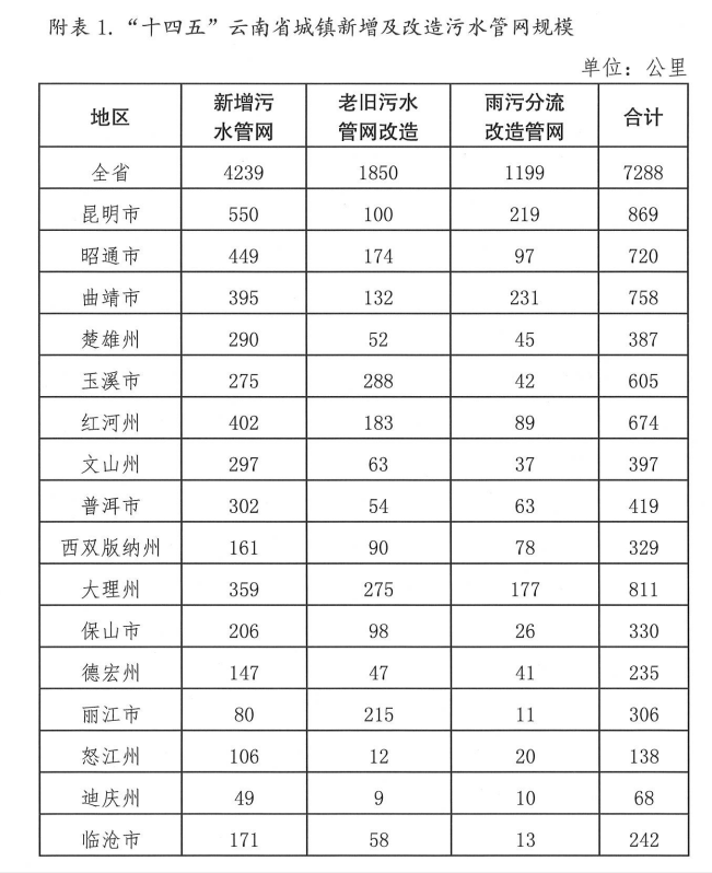 《规划》明确,“十四五”期间,新增和改造污水收集管网7200公里,其中,新增污水管网4200公里;老旧污水管网改造1800公里;雨污分流改造1200公里。