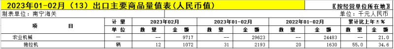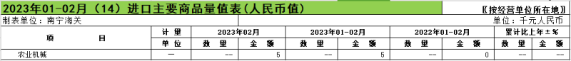 【农机网 市场行情】近日,南宁海关发布2023年1-2月进出口主要商品量值表(人民币值)。其中,农业机械相关情况如下:
