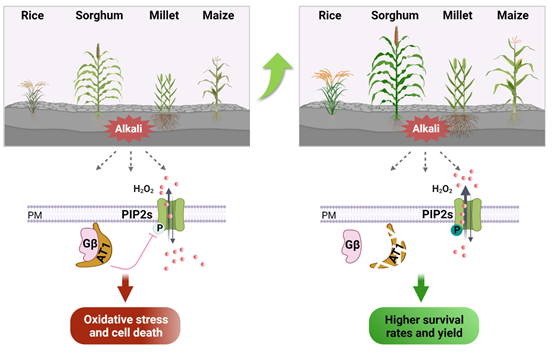 为揭示AT1调控植物碱胁迫响应的分子机制,利用免疫共沉淀联合LC-MS蛋白质谱的方法鉴定到AT1的互作水通道蛋白SbPIP2;1/2;2和SbPIP1;3/1;4,并证实AT1与它们在植物体内体外均存在相互作用。利用pH不敏感的H2O2特异性荧光探针Cyto-roGFP2-Orp1进行实验,发现在盐碱胁迫环境下,PIP2;1促进过氧化氢(H2O2)外排以减轻碱胁迫对细胞带来损伤,AT1/GS3通过抑制PIP2;1蛋白的磷酸化水平影响细胞中活性氧水平。因此,在碱胁迫条件下,AT1可能通过减弱PIP2;1的磷酸化来调节植物细胞中的ROS稳态,植物进而表现出碱敏感的表型;改造该基因则可缓解此毒害,赋予植物高耐盐碱性。
