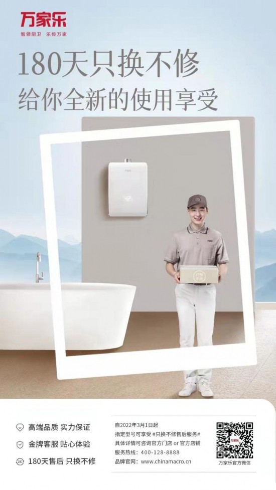 “180天只换不修”是万家乐向消费者发起的“安心购,放心享”售后服务升级活动,于2022年3月正式启动。针对旗下A3小体积燃气热水器等多款中高端厨卫新品,万家乐向用户承诺,在产品安装后180天内,如出现因质量问题导致的故障,将一律执行“只换不修”的服务标准,为用户免费换新。