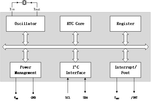 振荡电路用于激活外接晶体振荡;RTC内核可以产生标准时间信号;寄存器设有19个可寻址的 8 位并行寄存器,分别控制寄存器状态、年、月、周、日、时、分、秒、告警、定时器、负载电容选择等功能;电源管理分别为数字电路、振荡电路、芯片基准电路、芯片启动电路等提供电流;I²C提供了人机读写接口,用户可以根据需要对多种功能输出进行自由编程,非常灵活和方便;中断输出电路可以输出不同频率(32K/1024/32/1Hz),以及计时中断和告警中断输出。